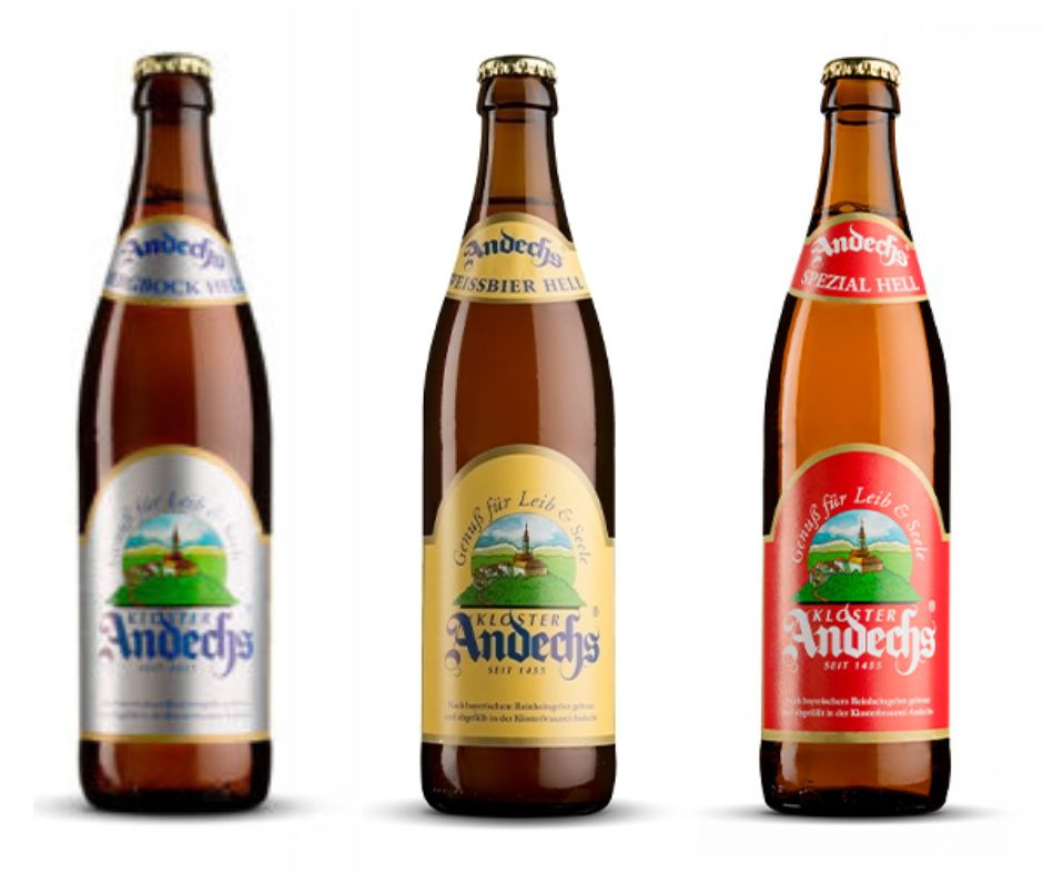 Las especialidades de Cerveza del Monasterio, solo se elaboran y embotellan localmente en Andechs: Doppelbock Dark, Export Dark, Bergbock Hell, Spezial Hell, Weizenbock, Weissbier Hell, Dark Weissbier y cerveza de trigo sin alcohol.